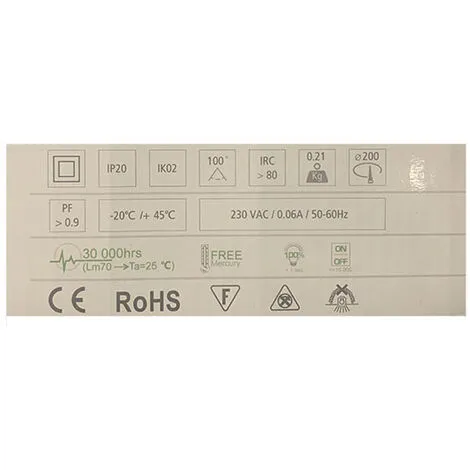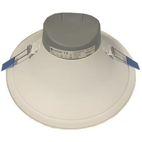 Puissance: 19W. Efficacité lumineuse: 96Lm/W. 811 cd. Flux lumineux: 1850Lm. Température de couleur: 6000K. Angle: 100°. Gamme: Downlight. Durée de vie: 30000heures. Tensions: 230Vac. Température de couleur: 6000K. IP20 – IK02. IRC>80. Diamètre: 200mm.