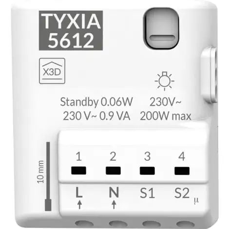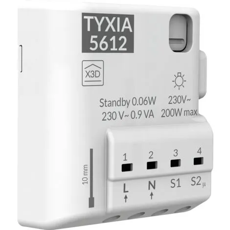 Le Tyxia 5612 est un récepteur qui permet d’ajouter des commandes sans fil pour la gestion d’un ou de deux éclairages. Il peut contrôler tous types d’éclairages dans la limite de 200 watt.Le récepteur peut être installé dans un boitier d’encastrement derrière votre interrupteur, une boite de dérivation ou dans un faux plafond. L’installation du récepteur n’impacte en rien l’installation existante, vous gardez le contrôle manuel de votre éclairage via l’interrupteur existant.Le Tyxia 5612 est idéal pour commander simultanément deux éclairages, dans une salle de bain par exemple.Pour disposer d’une gestion de vos volets déportée, il peut être associé avec plusieurs points de contrôle simultanément incluant : les télécommandes , interrupteurs sans fil et l’application Tydom. Grâce à l’application Tydom, vous pouvez gérer vos éclairages à distance. Vous pouvez également les programmer, scénariser et contrôler à la voix (avec l’ajout d’un assistant vocal compatible). L’application Tydom est évolutive et vous permet également de contrôler vos ouvrants, gérer votre chauffage, sécuriser votre habitation avec une alarme ou des caméras …